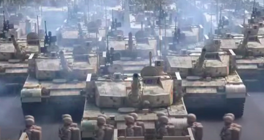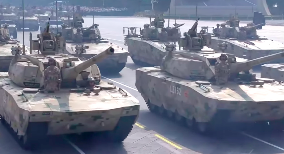 坦克编队中打头阵的是目前解放军陆军装备的重量级装备:ZTZ-99A主战坦克。