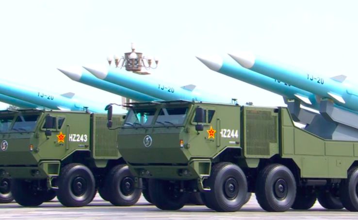 YJ-20,看上去跟之前在珠海航展亮相过的YJ-21导弹类似,外观的区别是与挂在轰炸机上空中发射的YJ-21比,YJ-20多了一截助推器。这说明它可以从水面舰艇或者潜艇的垂直发射装置起飞,以极高的速度打击敌方舰艇。